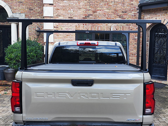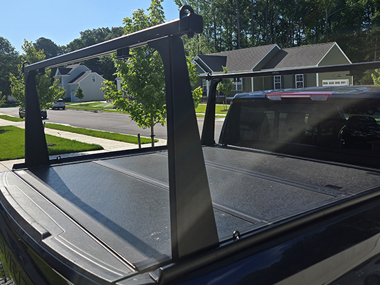 " I have a folding hard tonneau cover on a 2023 Ford F-150. The rack system was easily installed on top of it and the tonneau still works perfectly. I use the racks to transport two 14' prone paddle boards to and from the beach. Could not be happier with the product. It's solid and looks cool. "